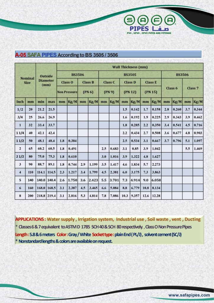 الفئتان 6 و7 تعادلان ASTM D –1785 وSCH 40 وSCH 80 على التوالي.